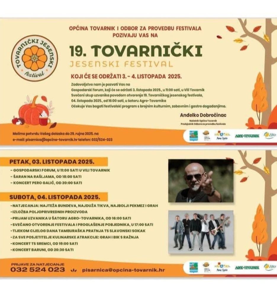 U Tovarniku je prvi vikend u listopadu rezerviran za Jesenski festival, a 19. izdanje festivala imat će i dodatnu dimenziju jer će se obilježiti 20. obljetnica Razvojne agencije TINTL. Festival je postao prepoznatljiv po bogatom programu, a započinje u petak u Vili Tovarnik gospodarskim forumom. Tema skupa je, kako nam je rekao načelnik Anđelko Dobročinac, uloga razvojnih agencija i ureda za međunarodnu suradnju s naglaskom na to koliko takvi subjekti mogu doprinijeti razvoju lokalnih sredina. Bit će to prilika za osvrt na dva desetljeća djelovanja razvojne agencije, ali i razgovor o budućim projektima.
