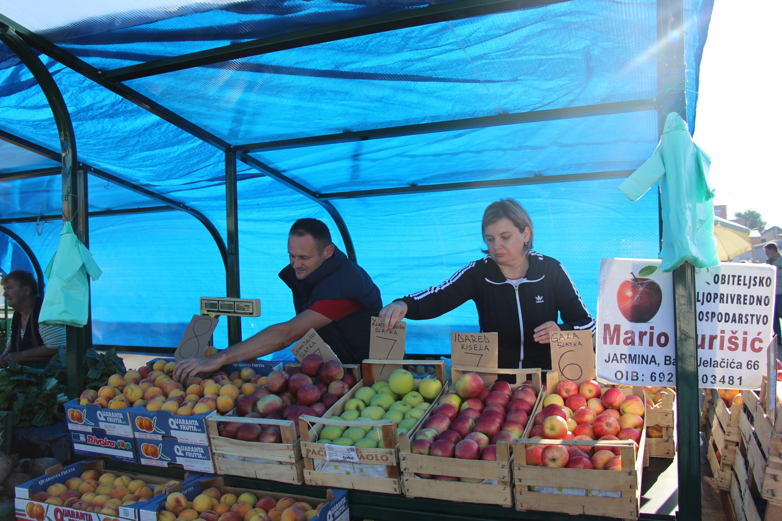 Obitelj Jurišić iz Jarmine jedan je od ponosnih vlasnika certifikata izvorno domaće što im je potvrda njihova danonoćnog rada kako bi na vinkovačkoj tržnici ponudili zdravo voće iz jarminskog voćnjaka. Puno se radi, kaže Mario, vlasnik OPG-a kojem na tržnici svake srijede i subote pomaže sestra.