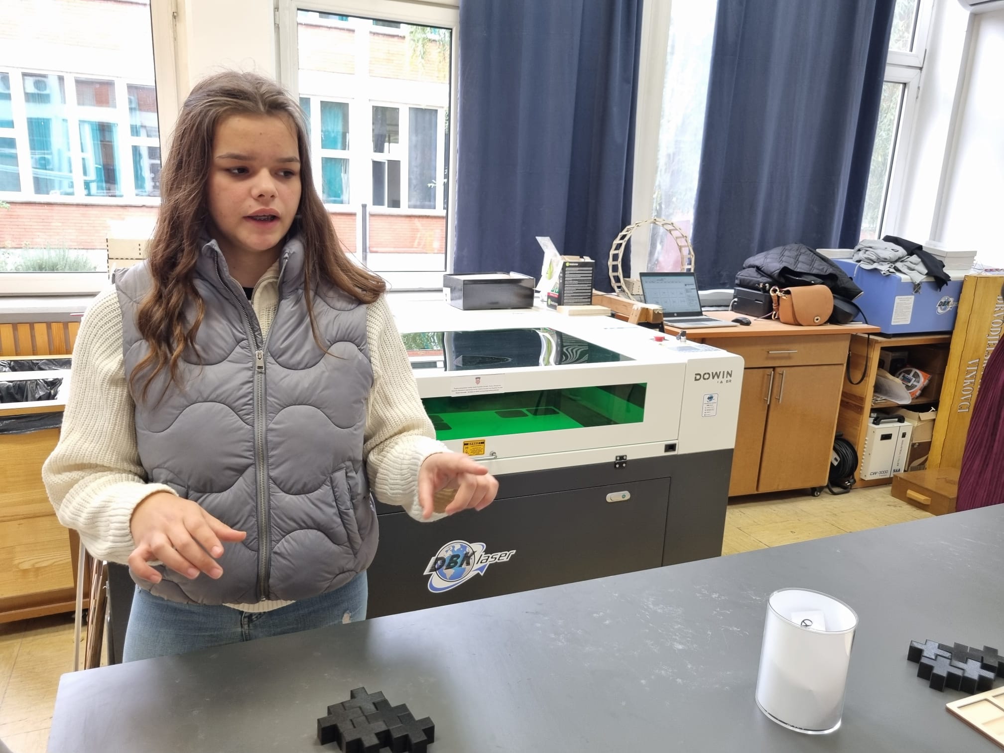 Učenica drugog razreda Marija Šokčević istaknula se znanjem na radionici projektiranje i lasersko izrezivanje i na baratanju s 3D tehnologijom. Naglasila je kako za izradu predmeta potrebna je mirna ruka i preciznost.