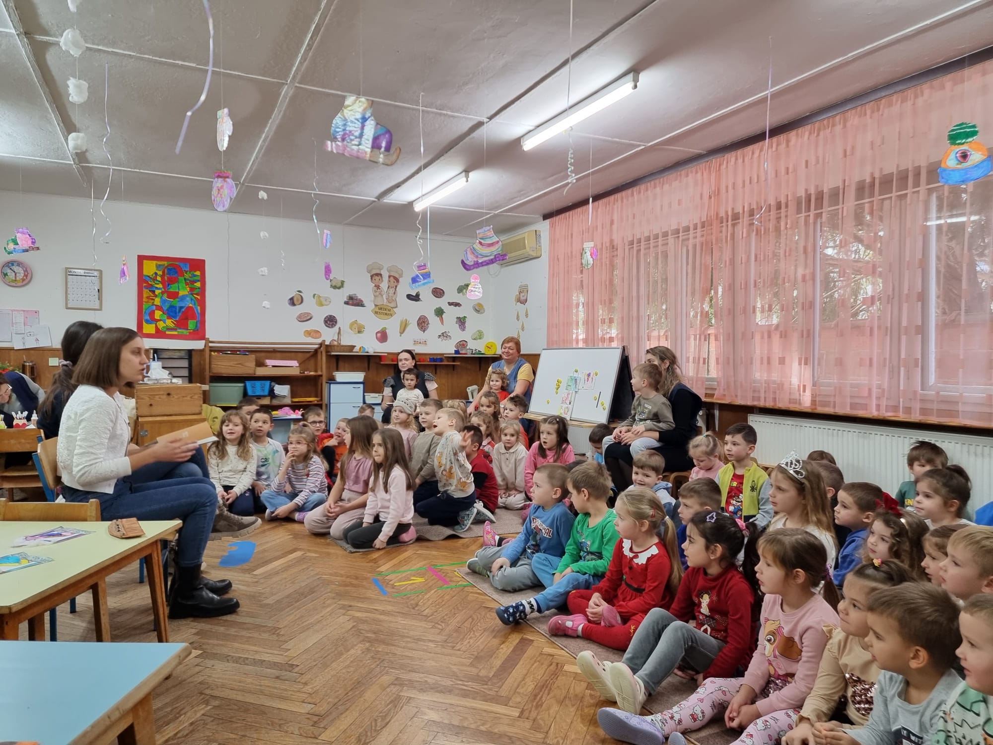 Kustosica etnologinja Nikolina Novaković i kustosica pedagoginja pripravnica Lucija Tomašević skupinama Pčelice, Aviončići, Vrapčići, Leptirići i Vilenjaci čitale su Priču o češlju i Priču o svirali iz publikacije Muzejske priče i jedna njuška, kroz koje su naučili više o muzejskim predmetima, pričama koje oni nose i važnošću čitanja od najranije dobi.