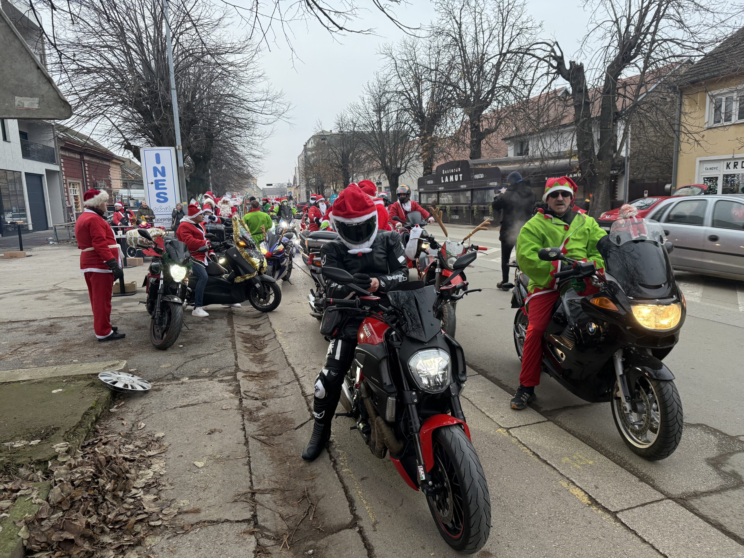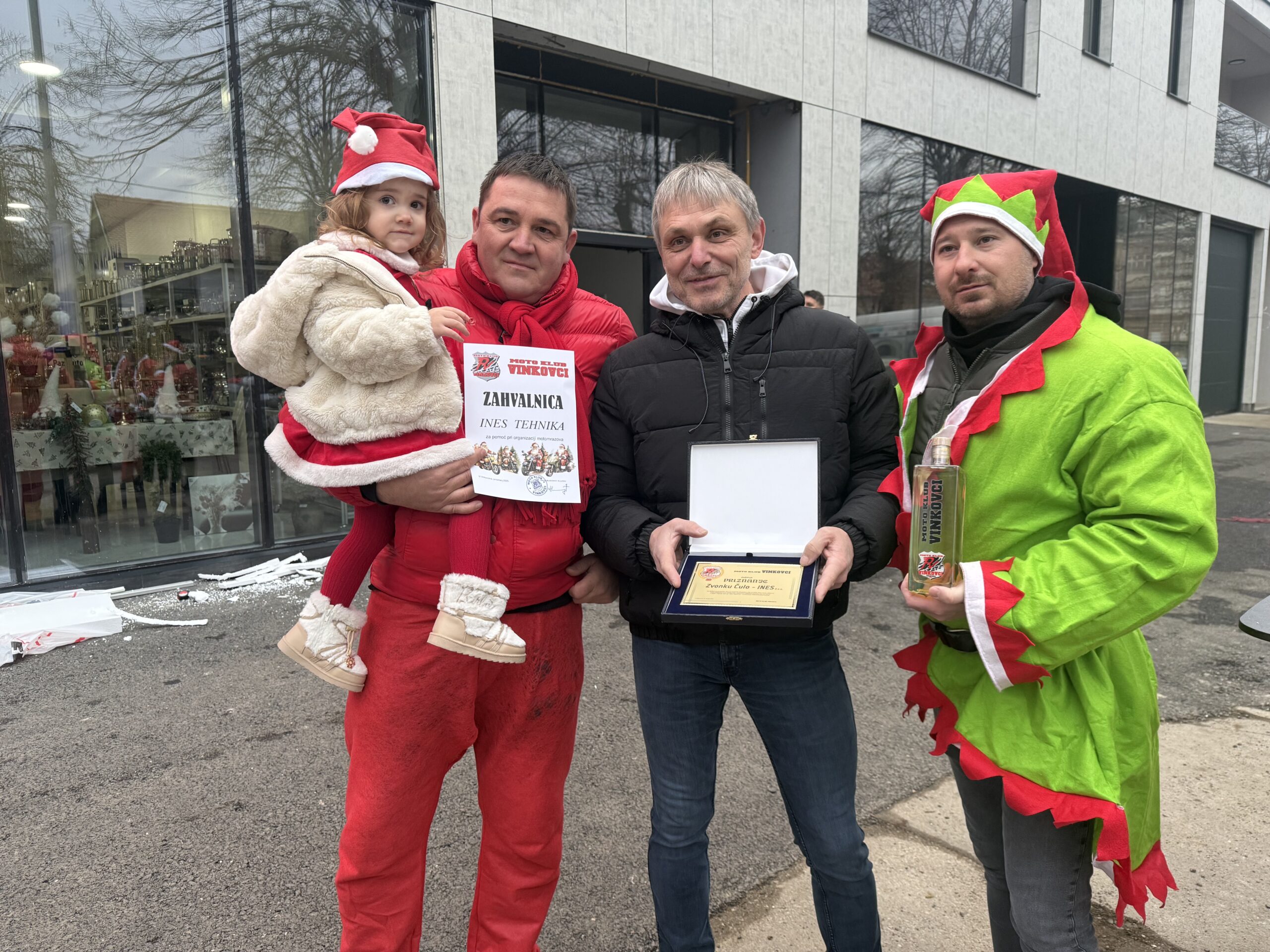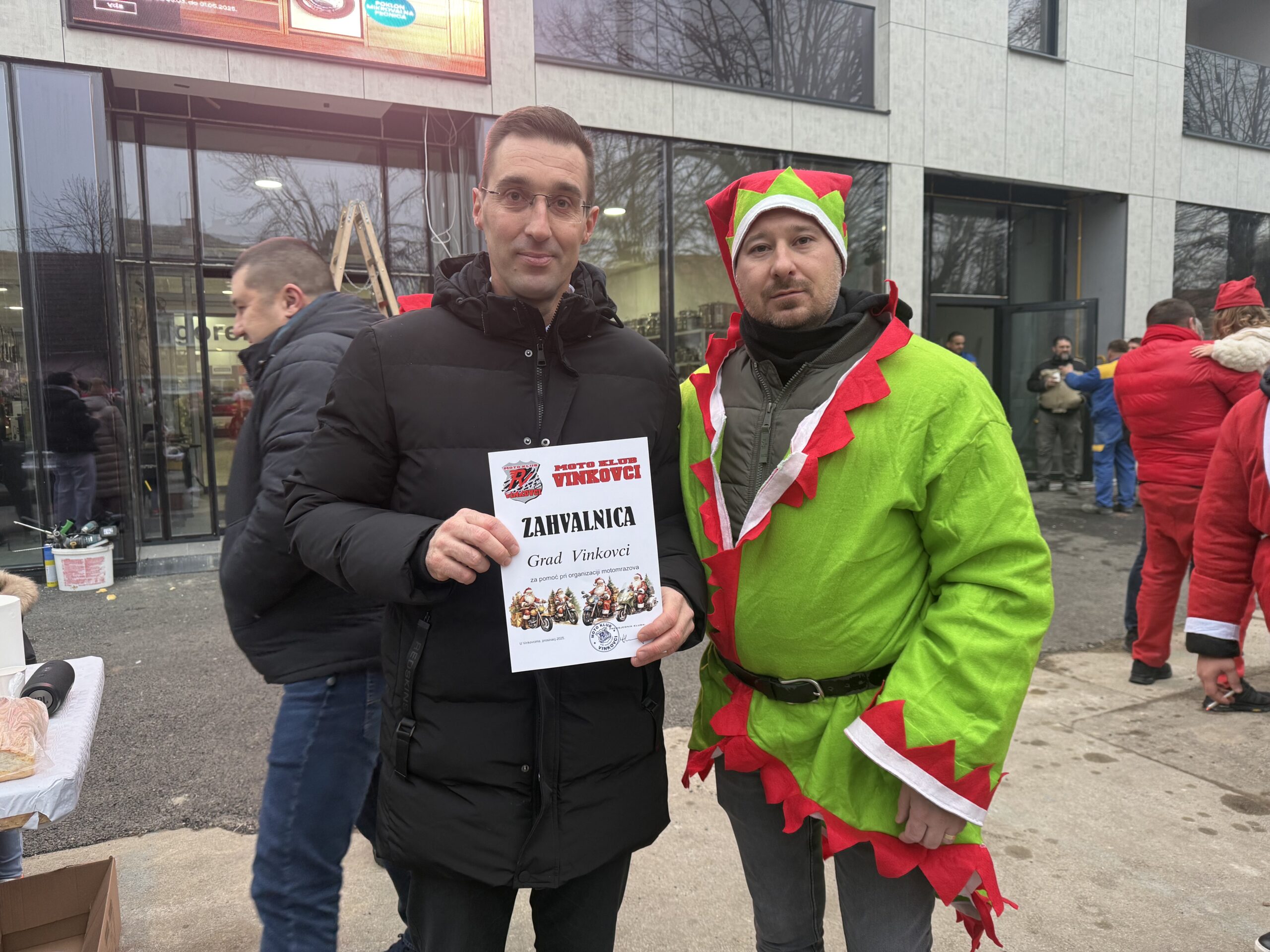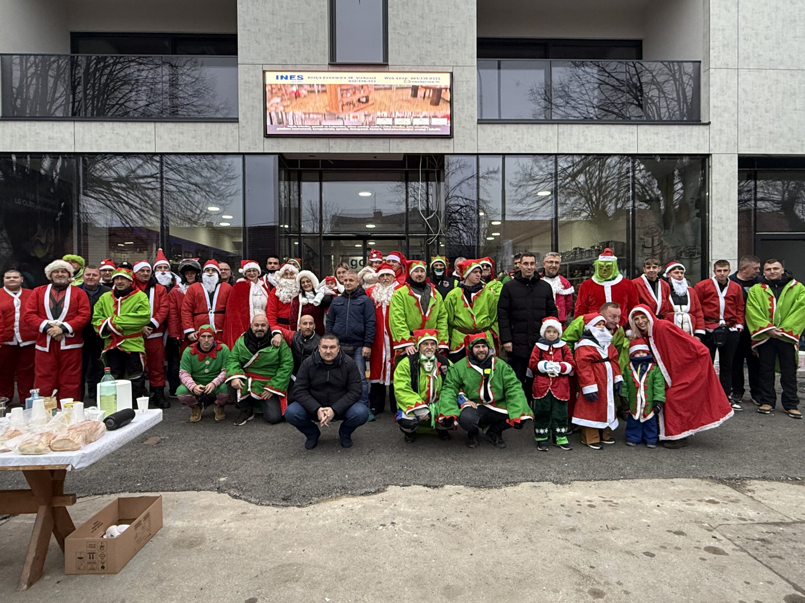Uz tek pokoji stupanj iznad „ništice” jutros su se ispred trgovine Ines okupili članovi Moto kluba Vinkovci. Ipak, nisu bili u svojim standardnim odjećama, obukli su kostime Djeda Božićnjaka, Baka Mrazica i vilenjaka, a našao se i pokoji Grinch.