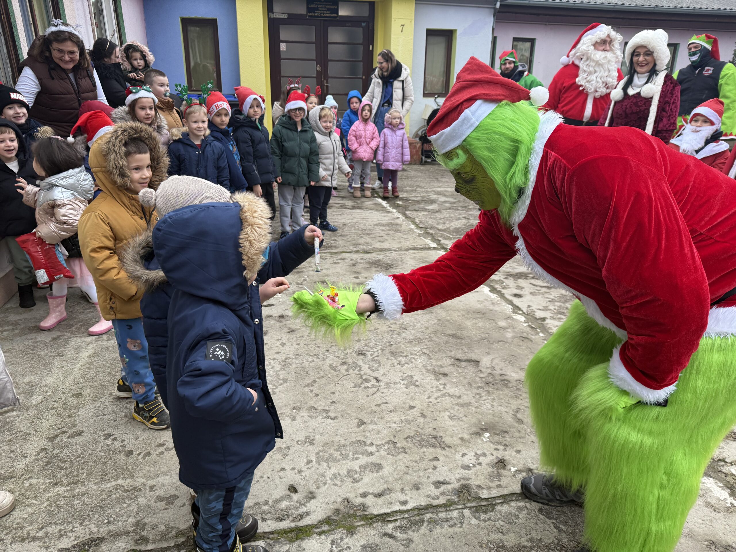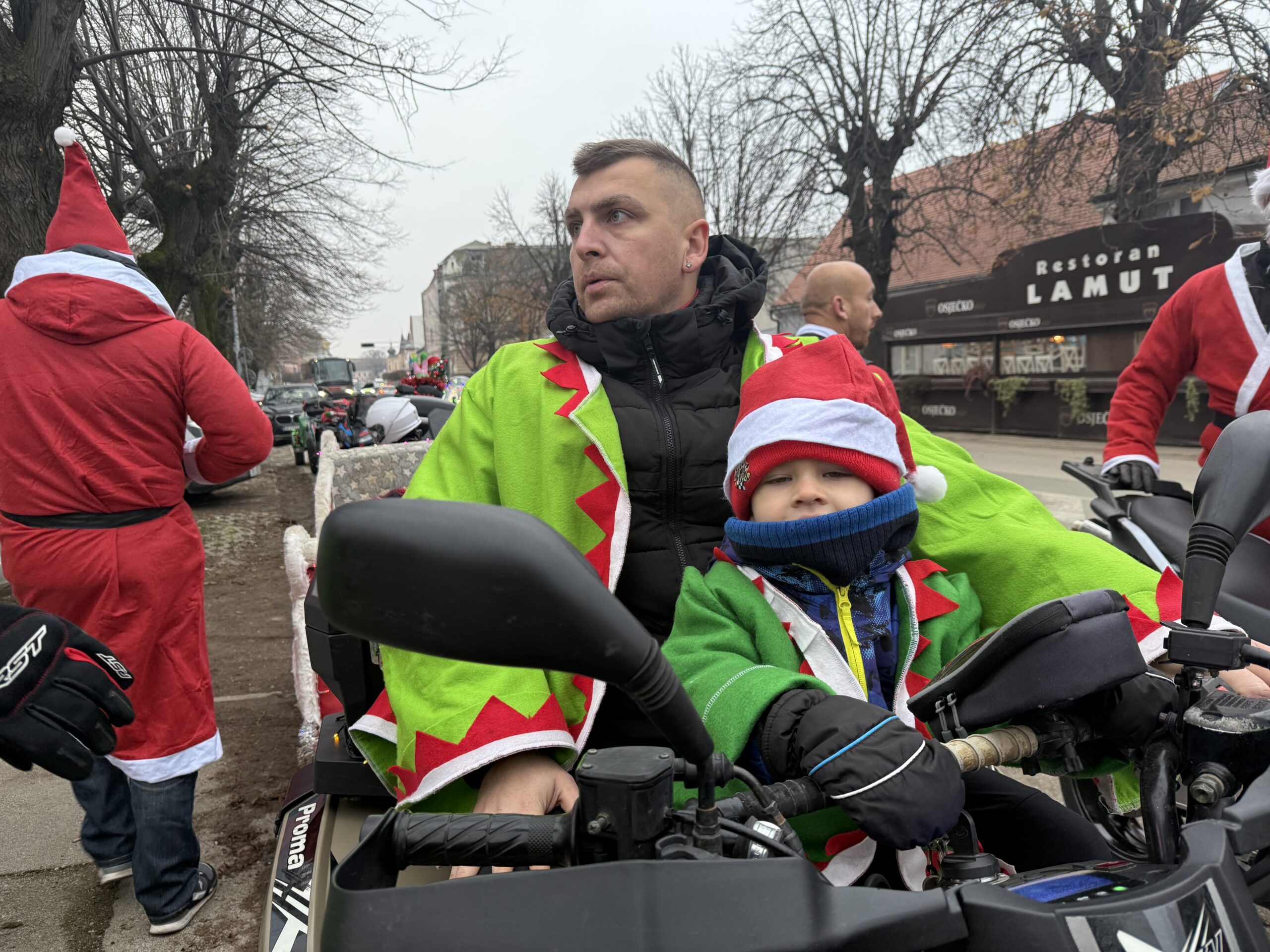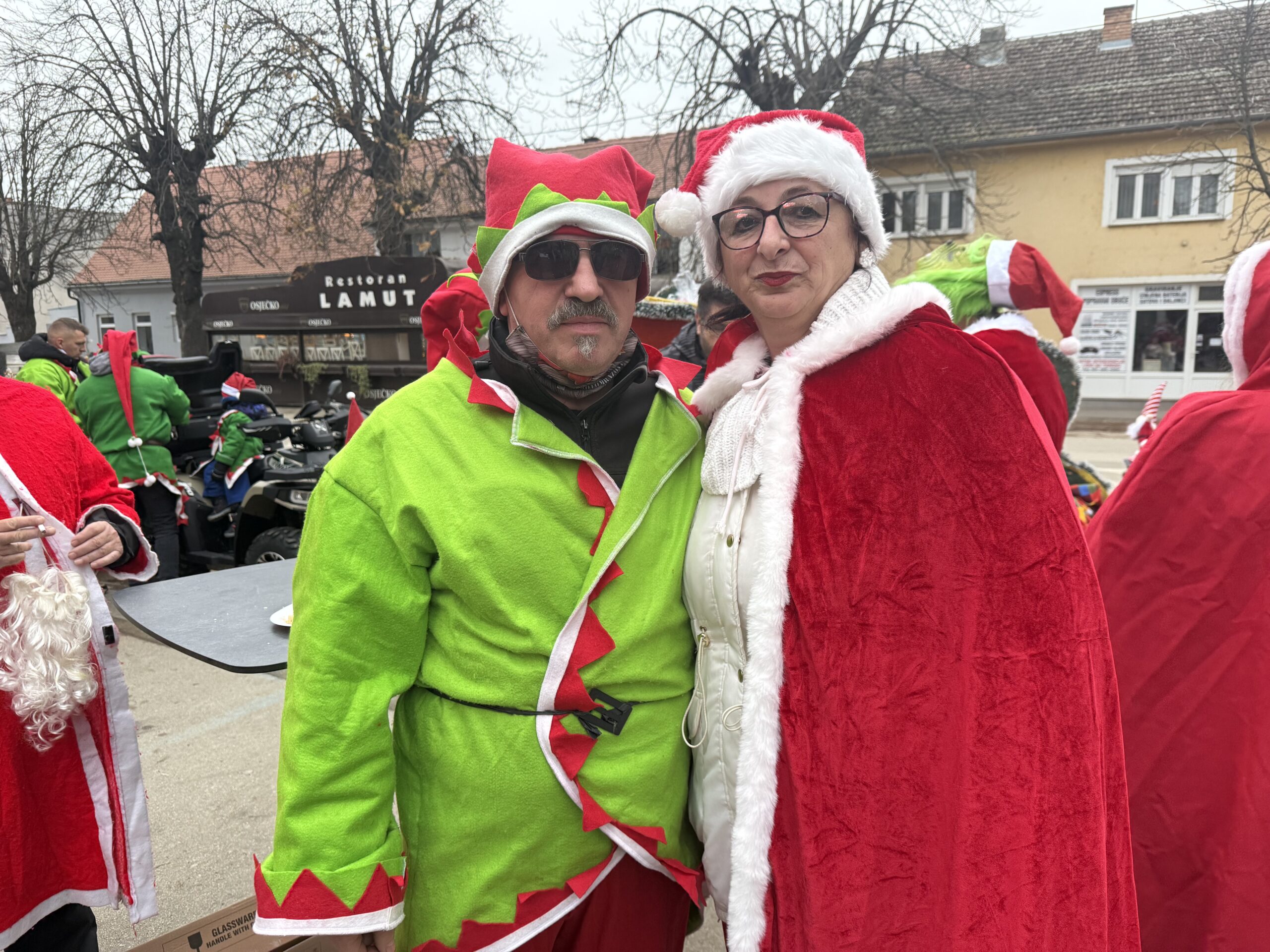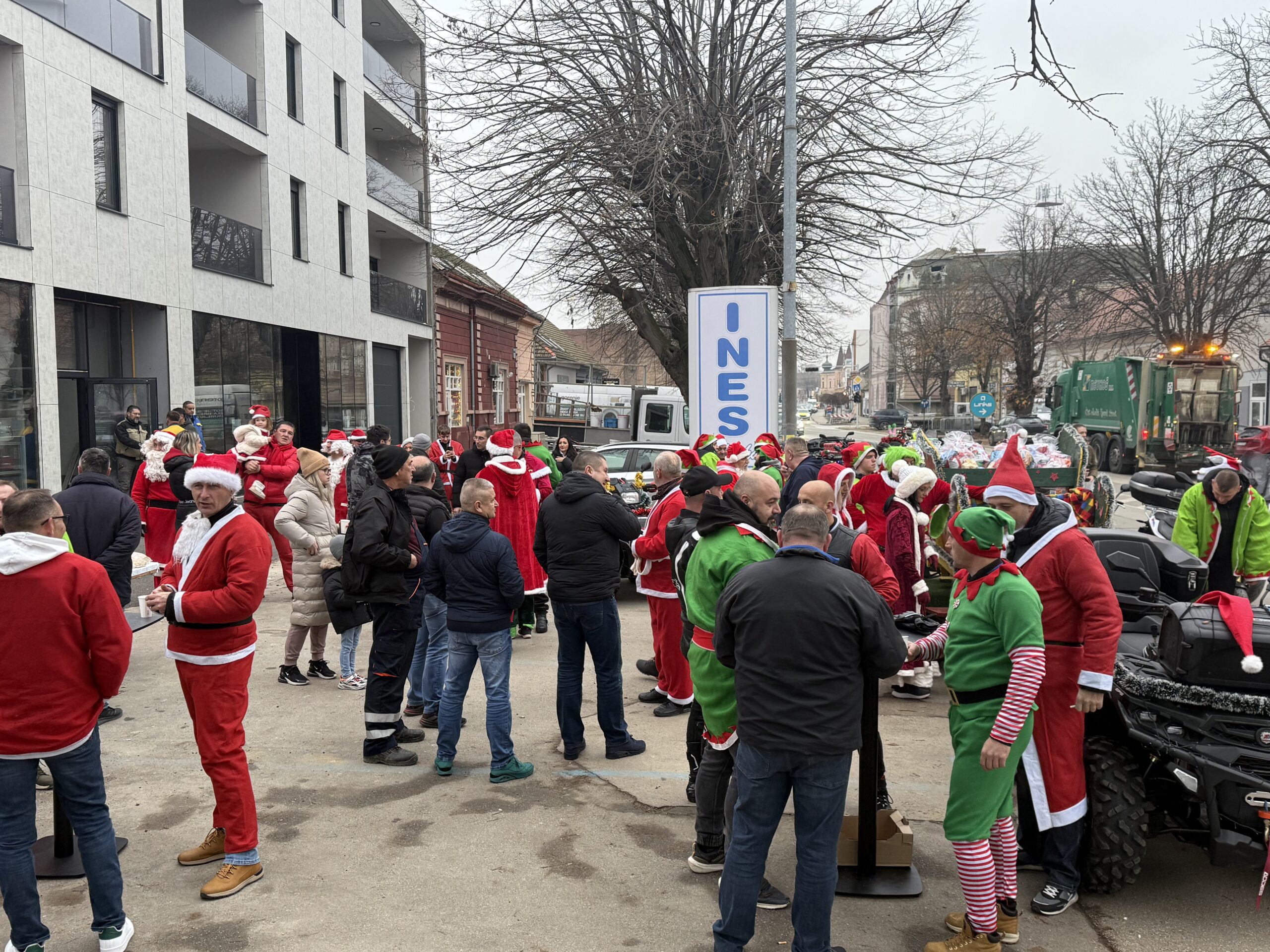 Uz tek pokoji stupanj iznad „ništice” jutros su se ispred trgovine Ines okupili članovi Moto kluba Vinkovci. Ipak, nisu bili u svojim standardnim odjećama, obukli su kostime Djeda Božićnjaka, Baka Mrazica i vilenjaka, a našao se i pokoji Grinch.