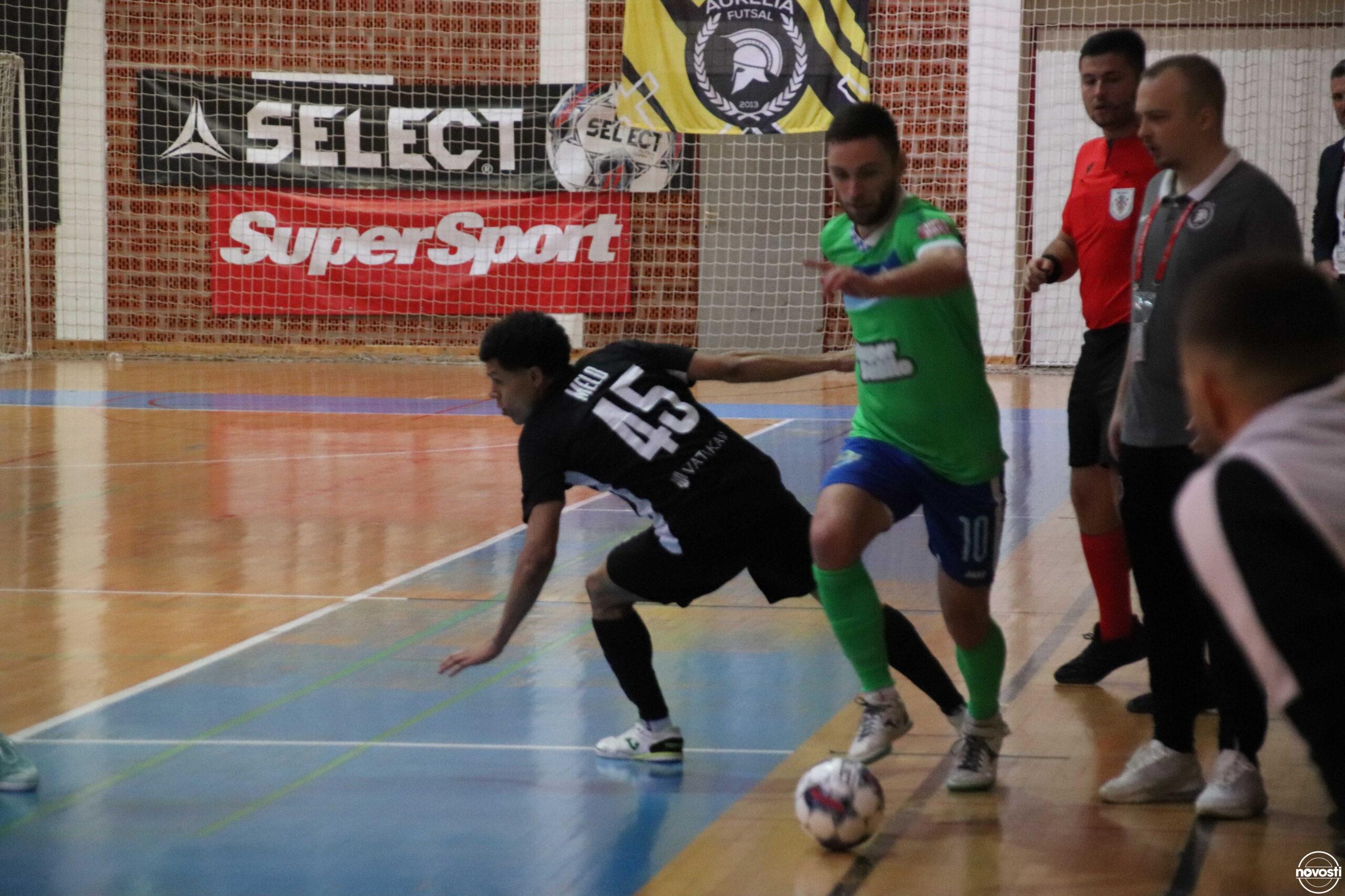 Olmissum je na početku utakmice imao potpunu dominaciju, što je i okrunio pogotkom Josipa Jurline u 3. minuti. Situacija na parketu se polako počinje mijenjati, dolazila je Aurelia do daha i nekoliko puta prijetila, no u 15. minuti Bruno Perty Branco podiže gostujuću prednost. U pretposljednjoj minuti prvog dijela Romeo Sušac smanjuje rezultat, ali vrlo brzo još je jednom precizan Perty Branco. Imali su žuto-crni u posljednjim trenucima priliku smanjiti rezultat iz deseterca, no Sušac pogađa stativu koja je ovoga puta bila saveznik Olmissumu.