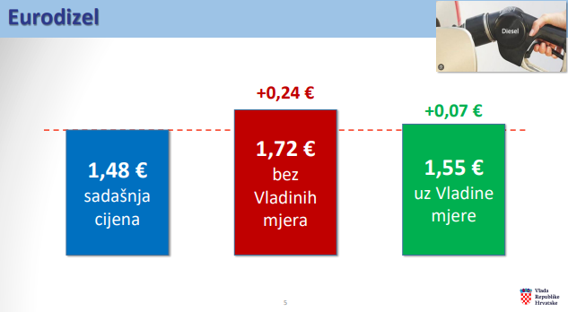 Trenutačna cijena eurodizela bez aditiva iznosi 1,48 eura po litri, koja bi bez mjera Vlade iznosila 1,72 eura. Cijene će biti limitirane na 1,55 eura po litri.