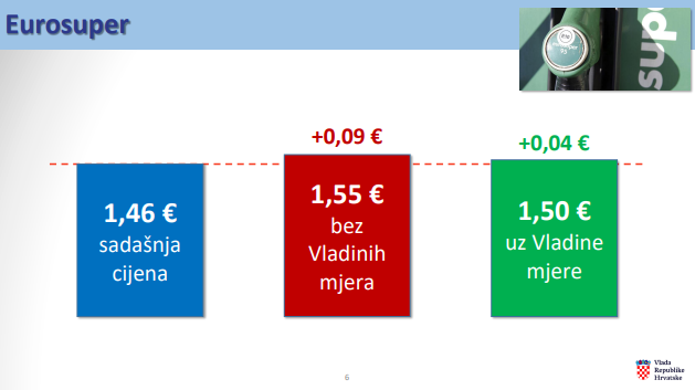 Litra eurosupera trenutačno iznosi 1,46 eura po litri, dok će uz Vladine mjere ta cijena, umjesto na 1,55 bez limitiranja, porasti na 1,50 eura.