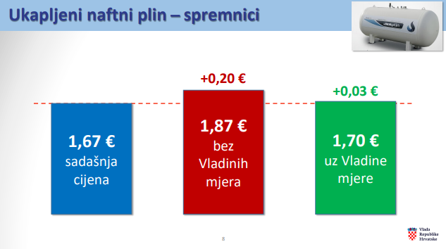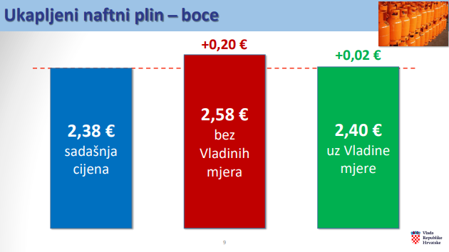 Nova cijena plina u boci bit će 2,40 eura za kilogram, a najviša maloprodajna cijena za spremnik će biti 1,70 eura za kilogram.