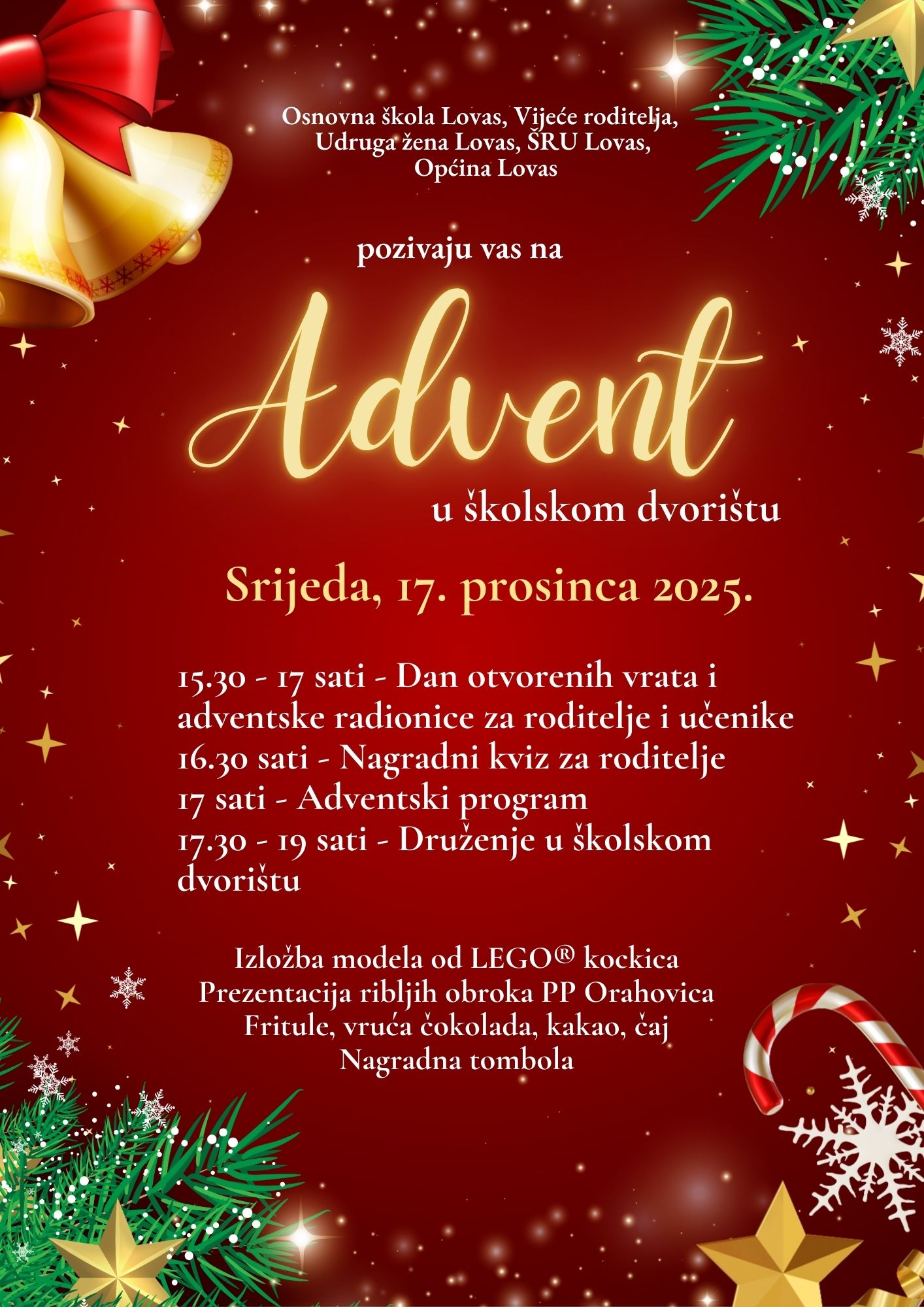 Iz Općine Lovas  pozivaju mještane na Advent u školskom dvorištu, u srijedu, 17. prosinca, u dvorištu Osnovne škole Lovas. Program će započeti u 15.30 sati Danom otvorenih vrata i adventskim radionicama za učenike i roditelje.