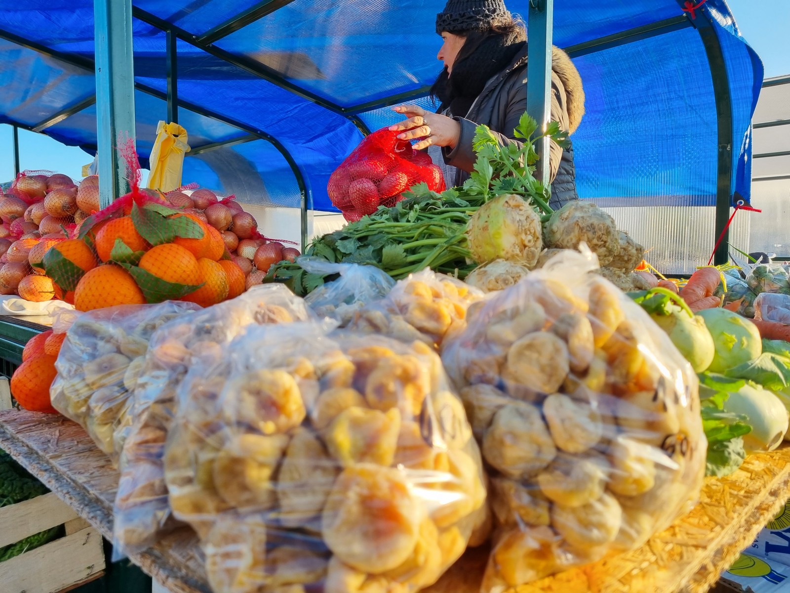 Uz svježe domaće sezonsko povrće među kojim prevladava kupus, kelj, špinat i grincajg, s Juga su stigle prekrasne mandarine i ostali agrumi, izvor C vitamina u zimsko vrijeme pandemije. Ne nedostaje ni sušenih jadranskih smokava koje su zdrava alternativa božićnim slasticama, a kilogram se kreće oko 60 kn. Med i proizvodi od aronije su zimi neizostavni u našim kućanstvima, a najsigurnije ih je nabaviti na tržnici od domaćih medičara. Svak već ima svoje mjesto, a šala ne nedostaje. Zanimljivo je kako ni jedan razgovor, uobičajeni pri susretu na tržnici, ne protječe bez teme cijepljenja, koronavirusa i covid potvrda, a razmjena mišljenja i stavova koji su uglavnom podijeljeni završava uz uvažavanje, pozdrav i nadu kako će sve brzo proći.