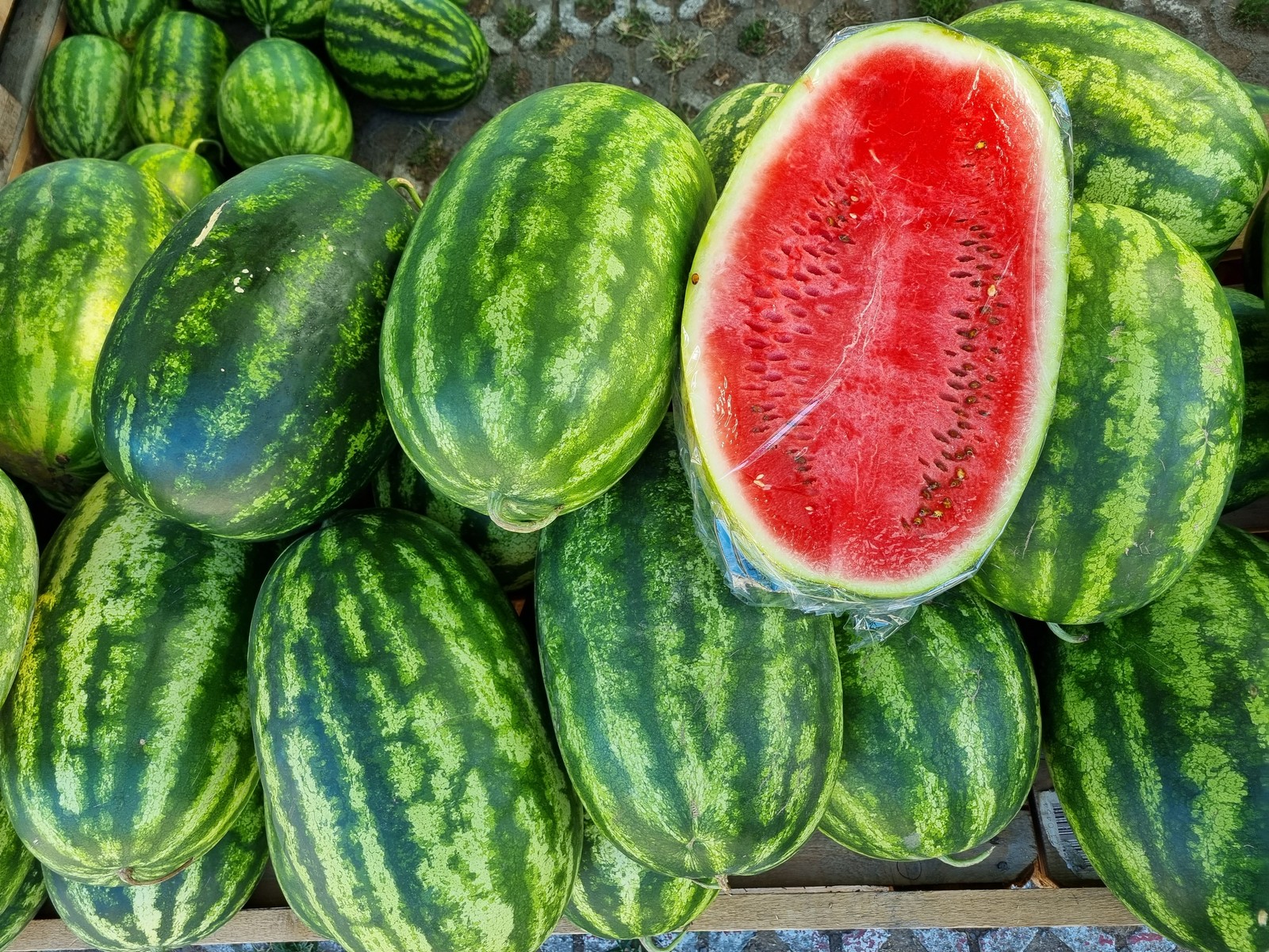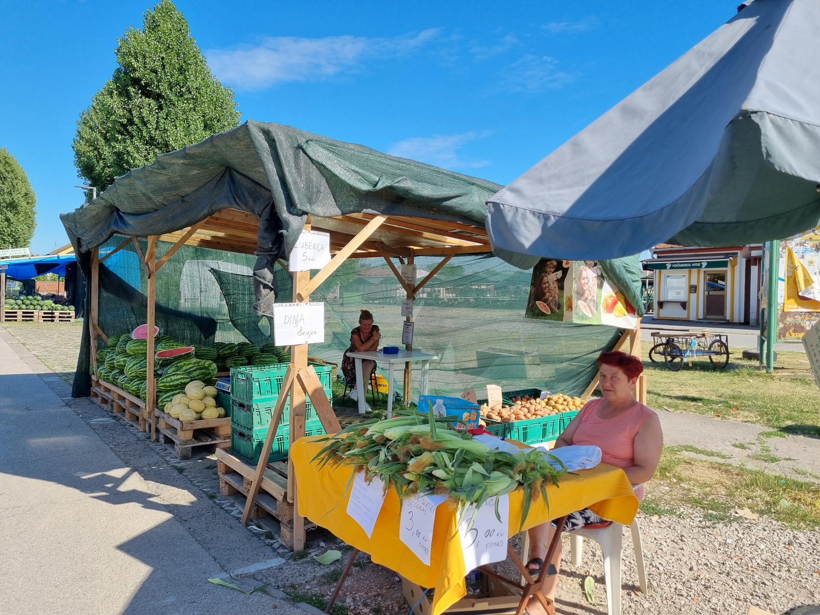 Prodaja domaćih lubenica na ulazu u vinkovačku tržnicu tek je počela. Na starom mjestu čekaju iz godine u godinu svoje kupce Bilići, Balići i vinkovački OPG-ovci Veselčići uz Opačiće s kukuruzom šećercem.