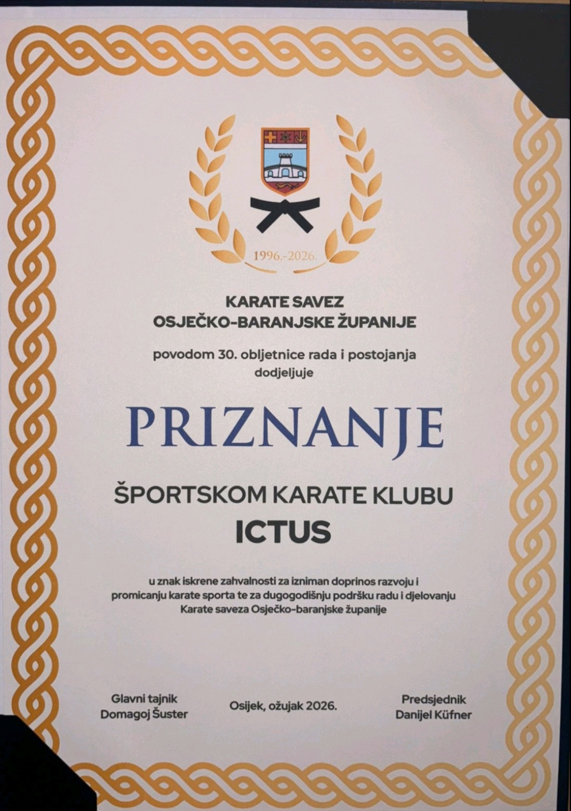 „Športski karate klub „ICTUS“ Vinkovci već dugi niz godina aktivno sudjeluje u radu Karate saveza OBŽ na način da je od osnutka Otvorene karate lige OBŽ davao puni doprinos njezinom razvoju, kontinuitetu kao i promicanju karate i parakarate sporta, a ovim priznanjem zasluženo je dugogodišnjom prisutnošću kluba u sustavu natjecanja i organizacije karate sporta, kao i kontinuiranom kvalitetnom radu Športskog karate kluba „ICTUS“ Vinkovci sa svim dobnim skupinama karatista i parakaratista koji su nebrojeno puta na najljepši način na natjecanjima predstavljali svoj klub, Grad Vinkovce i Vukovarsko-srijemsku županiju”, stoji u objavi Kluba.