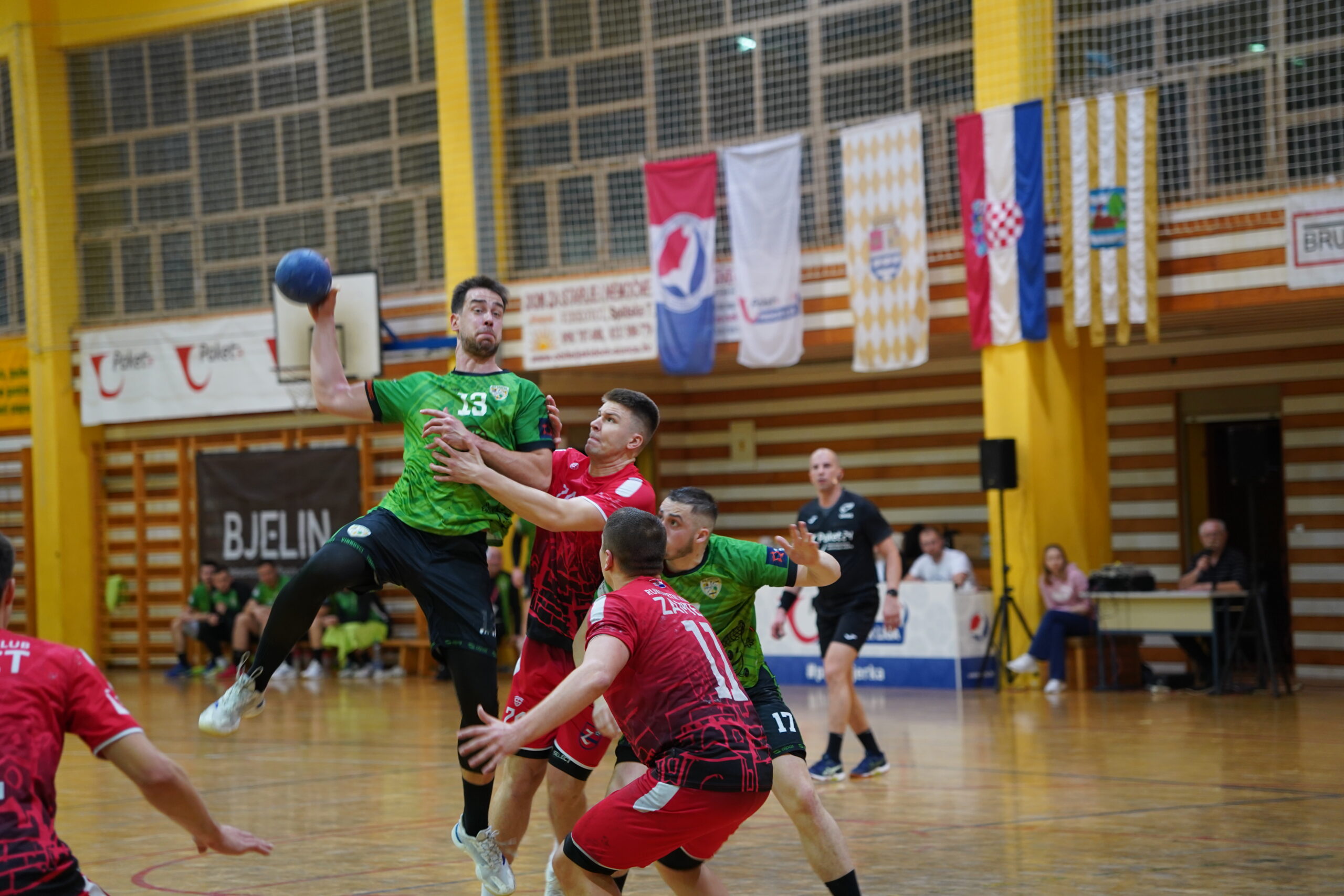 Tijekom početnog ispitivanja snaga gostujući igrači uglavnom su imali jedan pogodak prednosti, uz iznimku pri rezultatu 2:4. Zeleni su do prve prednosti stigli u 13. minuti kada je bilo 8:7. Do kraja prvih 30 minuta i dalje se igralo dosta izjednačeno, da bi Bjelin Spačva uoči odlaska na odmor otišla na +2.