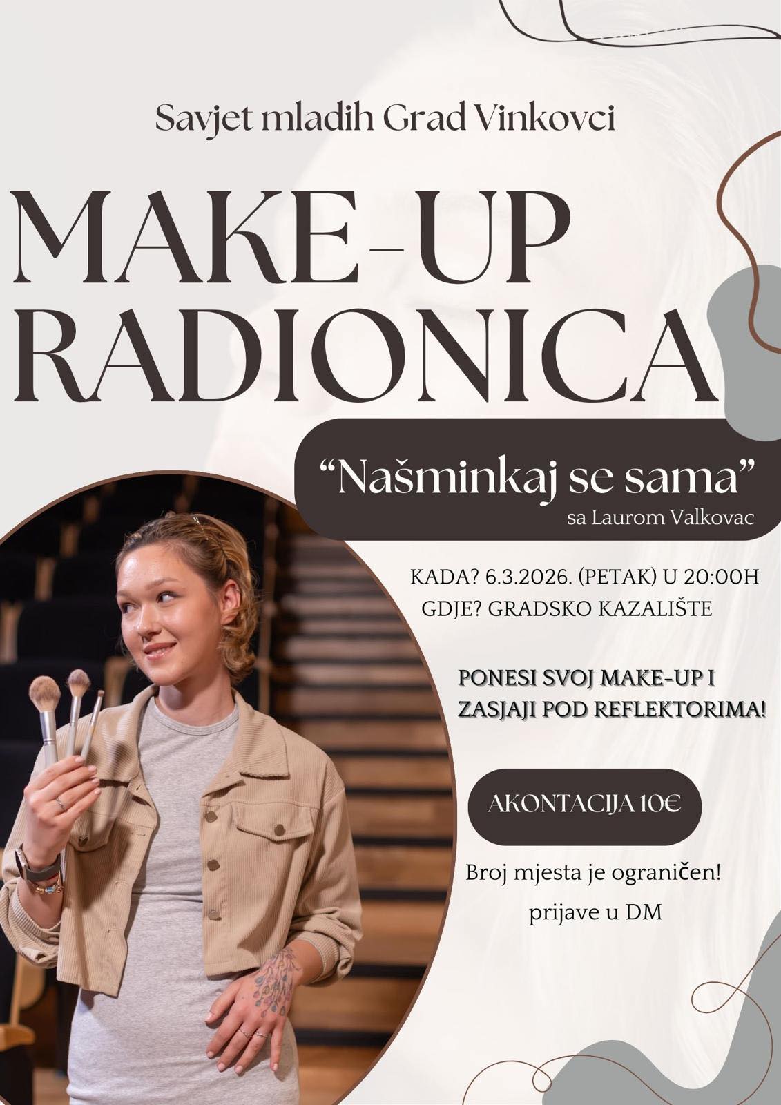 Radionicu će održati ovog petka, 6. ožujka, u Gradskom kazalištu Joza Ivakić Vinkovci s početkom u 20 sati, a potrebno je prijaviti se i ponijeti svoju osobnu kozmetiku s kojom će se raditi.