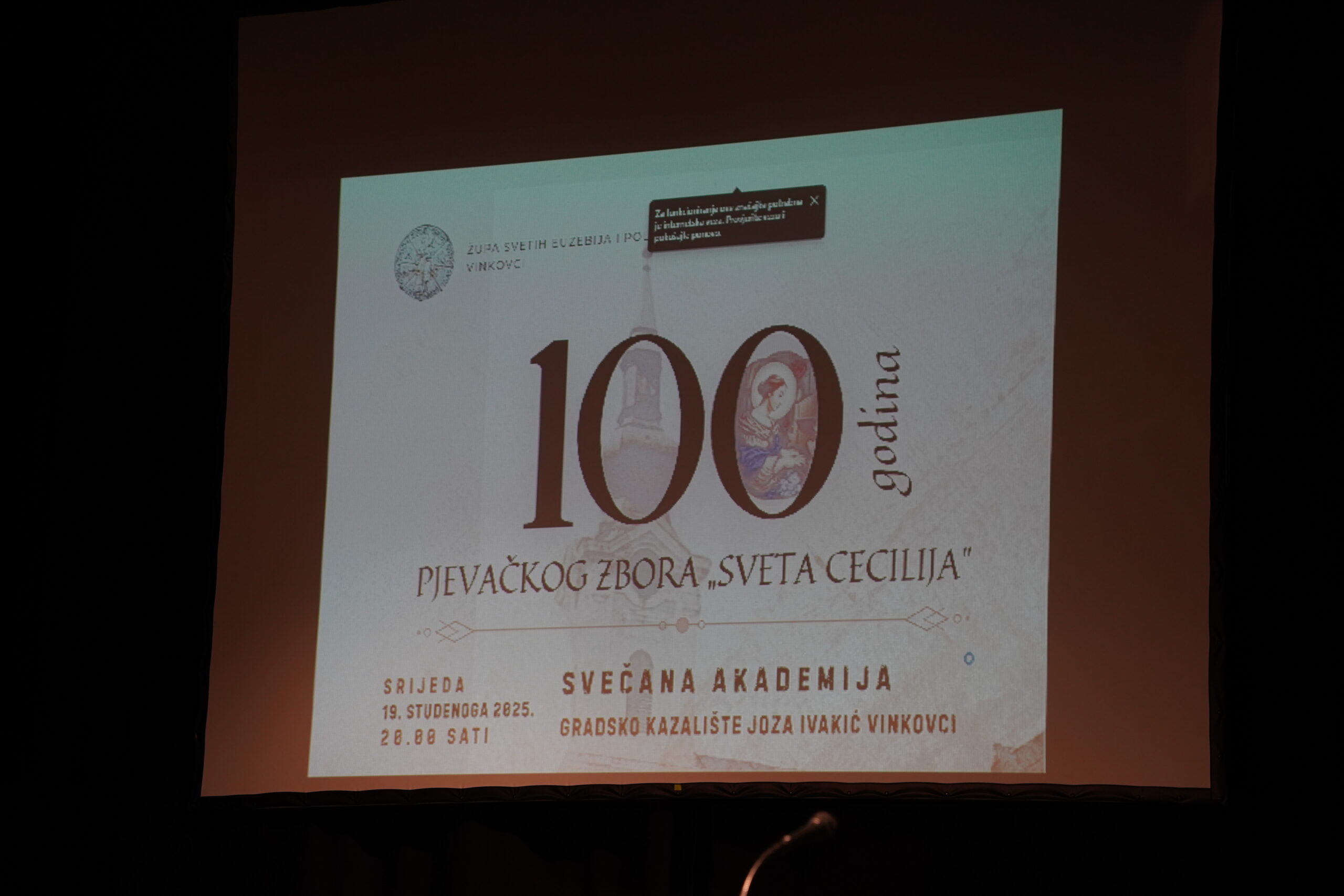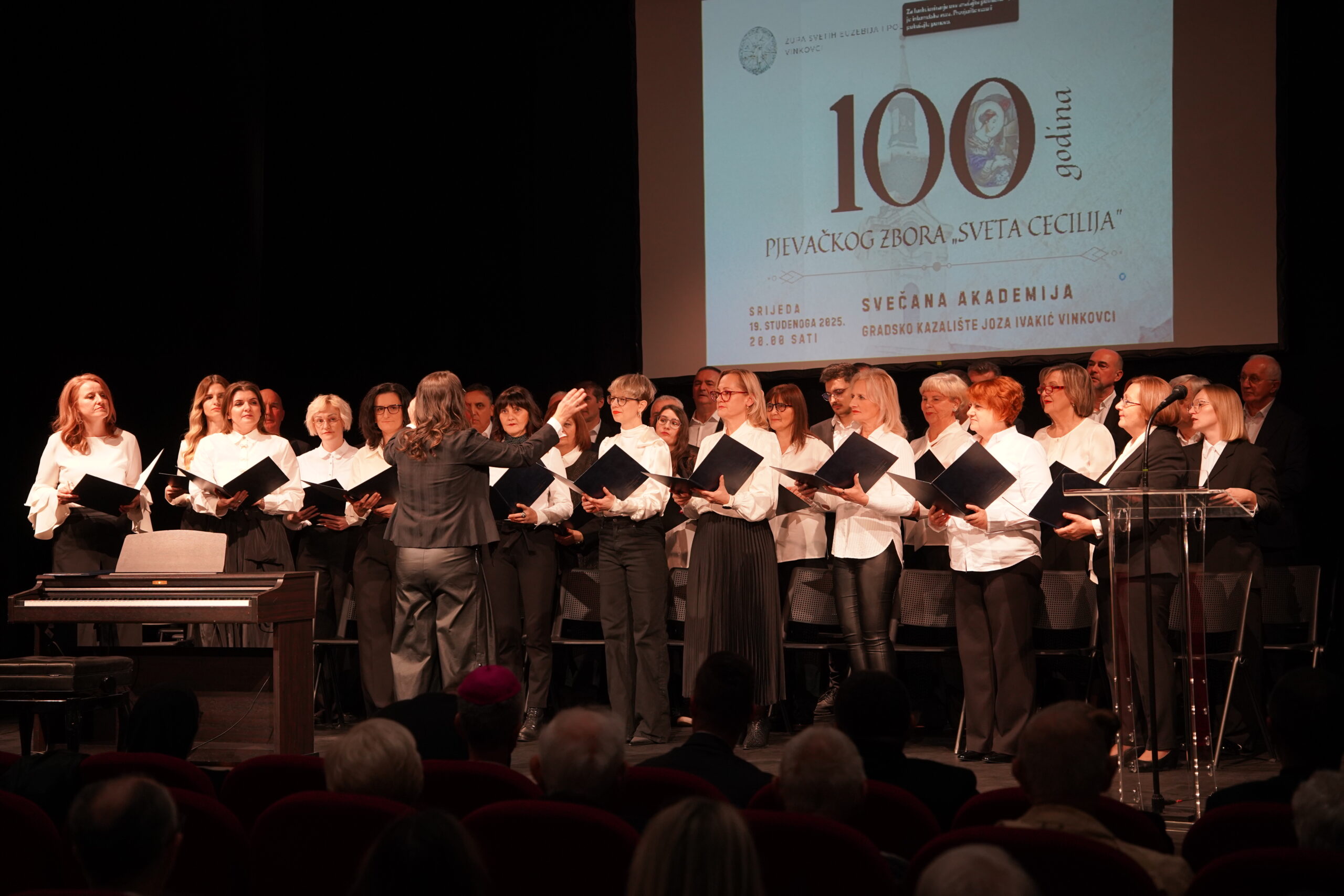 Mješoviti pjevački zbor „Sv. Cecilija” vinkovačke Župe sv. Euzebija i Poliona slavi 100 godina postojanja. Cijela godina protječe u ozračju velike obljetnice, a večeras je tim povodom u Gradskom kazalištu „Joza Ivakić” održana svečana akademija.
