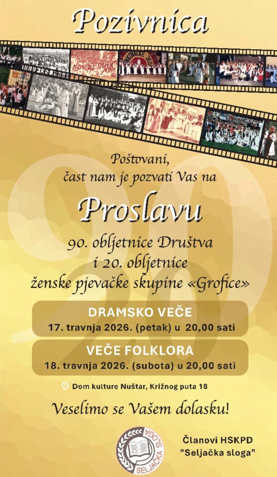 Članovi HSKPD-a „Seljačka sloga” Nuštar sutra i u subotu proslavit će 90. obljetnicu Društva, kao i 20. obljetnicu ženske pjevačke skupine „Grofice”, a uz tradicijsku pjesmu šalju svima i poziv da se pridruže.
