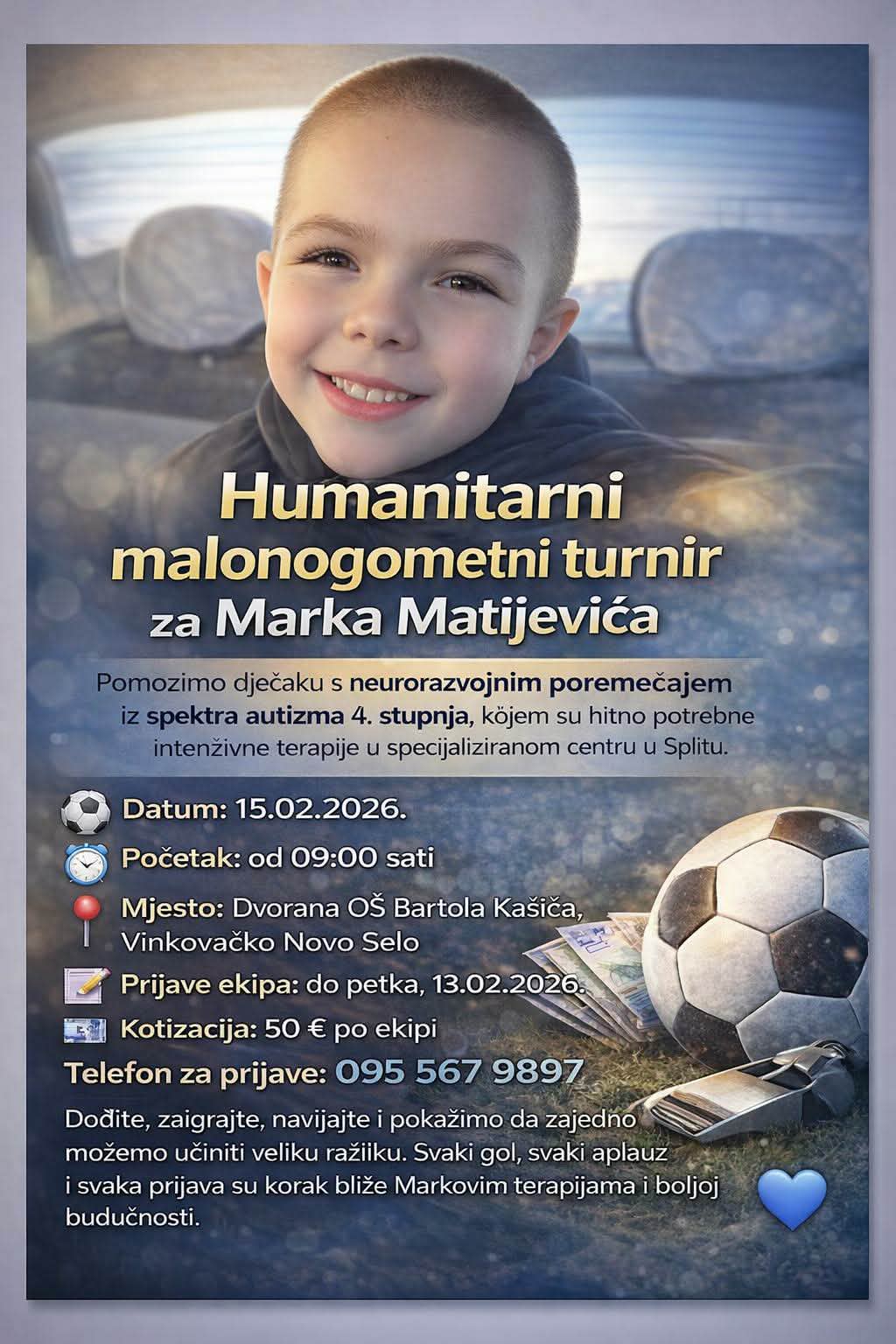 Humanitarni turnir još jednom pokazuje snagu zajedništva Vinkovaca. Nogomet je ovoga puta u drugom planu, a najvažniji cilj je pružiti Marku priliku za napredak i osigurati mu potrebne terapije. Novci se mogu donirati i putem IBAN-a HR6024020063104286844 uz opis plaćanja „Za liječenje Marka”.