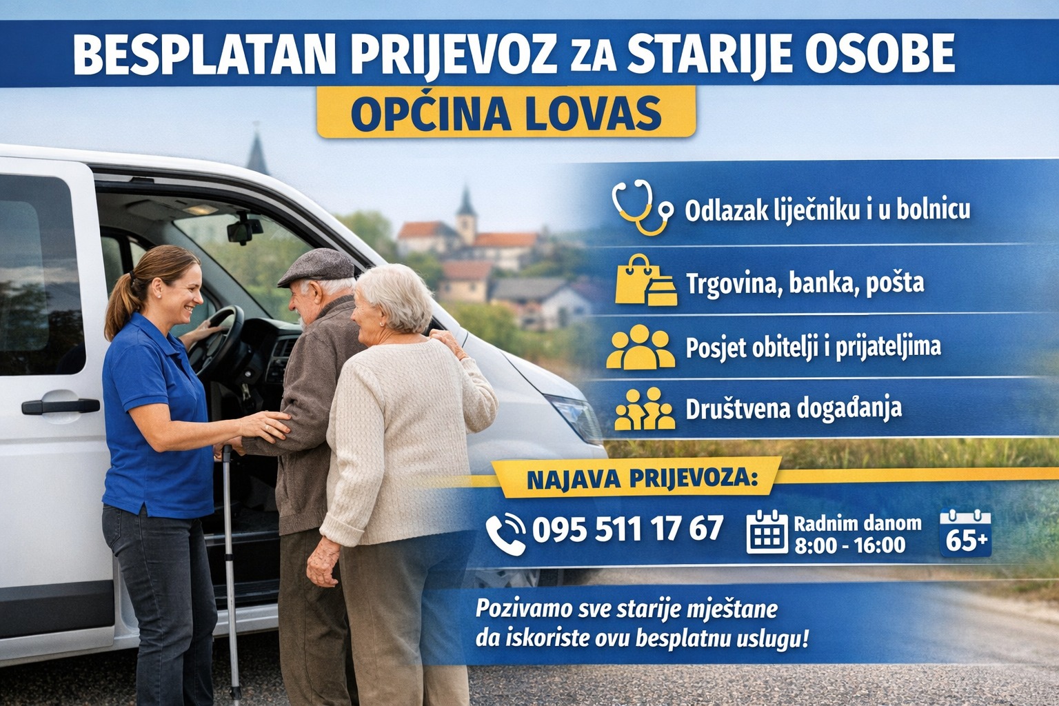 Starije osobe s područja Općine Lovas mogu koristiti besplatan organizirani prijevoz u sklopu programa „Niste sami – prijevoz za starije osobe u lokalnoj zajednici“, koji provodi Udruga žena Vukovar.