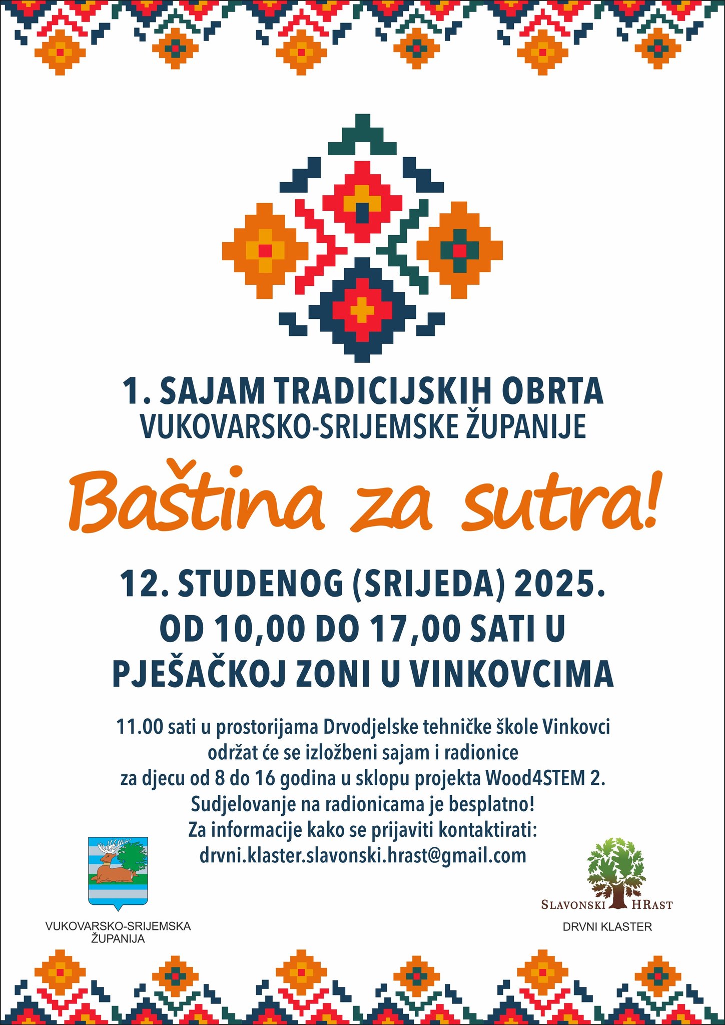 Sajam će, u suradnji s brojnim izlagačima i sudionicima, biti održan u srijedu, 12. studenoga, od 10 do 17 sati u vinkovačkoj pješačkoj zoni, gdje će posjetitelji moći uživati u bogatstvu ručnih radova, starinskih zanata, domaćih proizvoda i prigodnog kulturno-umjetničkog programa.