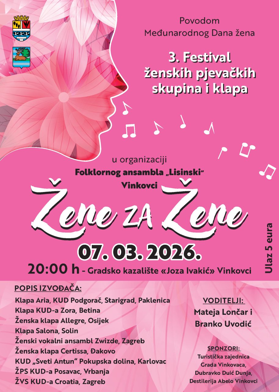 Povodom Međunarodnog dana žena, Folklorni ansambl Lisinski, u suradnji s Vukovarsko-srijemskom županijom, Gradom Vinkovcima i Turističkom zajednicom grada Vinkovaca, sutra, 7. ožujka, organizira 3. Festival ženskih pjevačkih skupina i klapa „Žene za žene”.